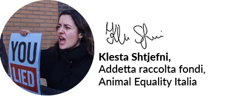 Mi chiamo Klesta e mi occupo di raccolta fondi per Animal Equality Italia. Il mio lavoro è spesso dietro le quinte, tra email, numeri e strategie. Ma alcune volte no, alcune volte scendo in strada per gli animali e in Olanda sono stata arrestata per loro.