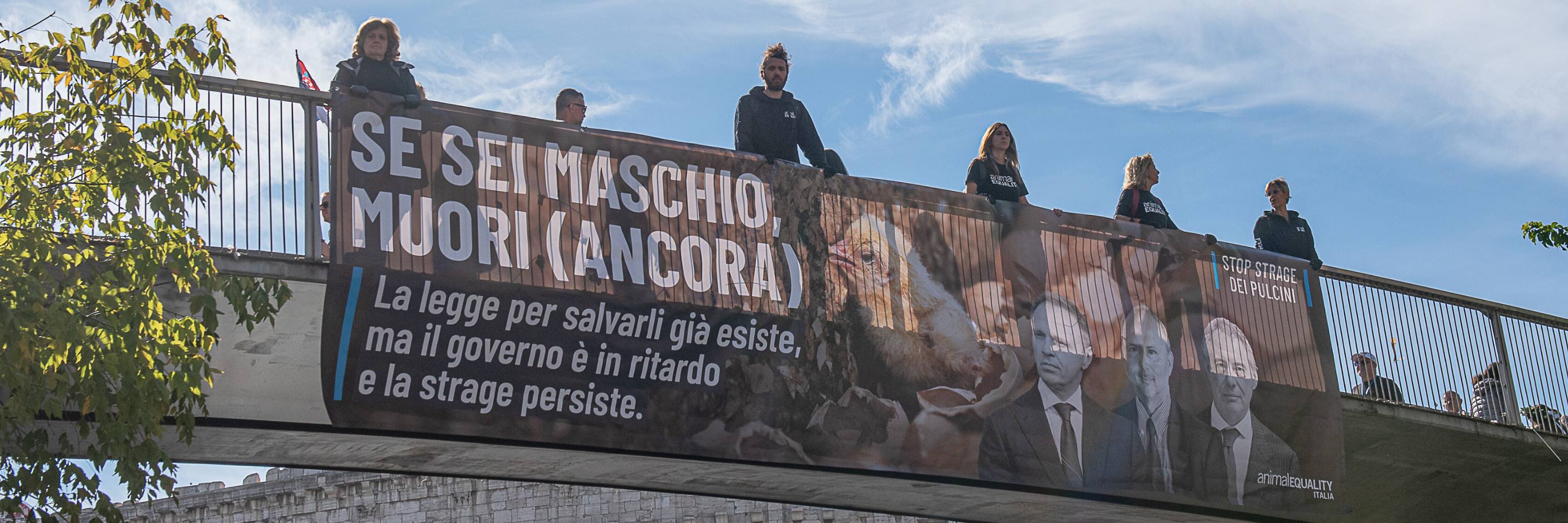 Gli attivisti di Animal Equality hanno dato vita a un’azione dirompente srotolando dal Ponte degli Annibaldi, davanti al Colosseo, un banner con il volto del Ministro dell’agricoltura, della sovranità alimentare e delle foreste, Francesco Lollobrigida; il Ministro delle Imprese e del Made in Italy, Adolfo Urso, e il Ministro della Salute Orazio Schillaci, accompagnati dalla frase: “Se sei maschio, muori (ancora). La legge per salvarli già esiste, ma il governo è in ritardo e la strage persiste”.