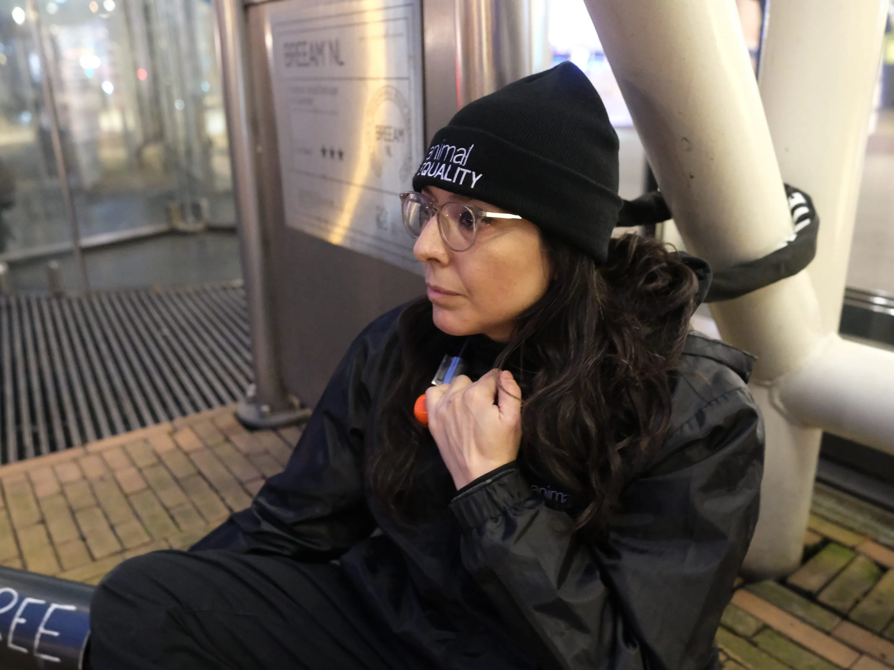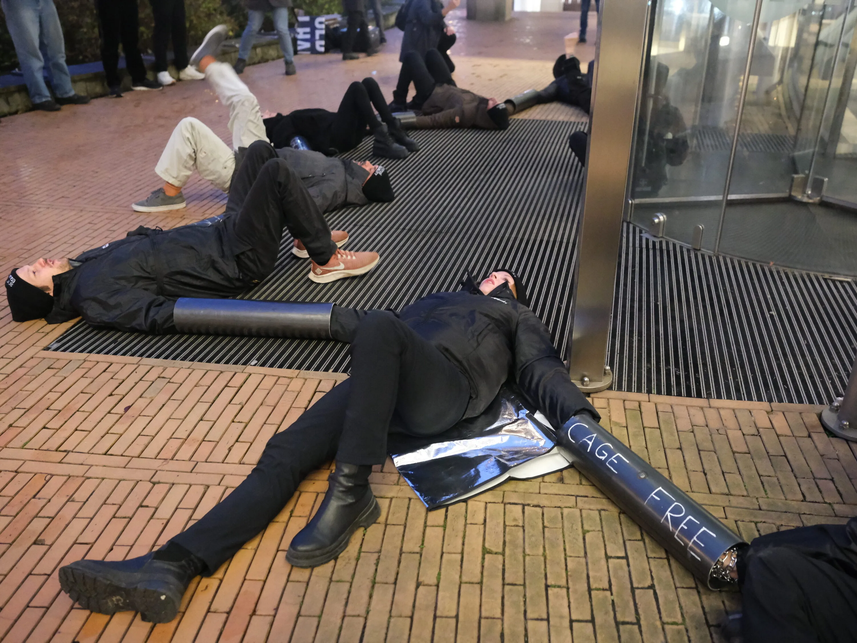 Durante la protesta di mercoledì 26 novembre ci siamo incatenati davanti alla sede centrale di Ahold Delhaize per chiedere all’azienda di rispettare il suo impegno, a lungo rinviato, di porre fine all’allevamento in gabbia per le galline.