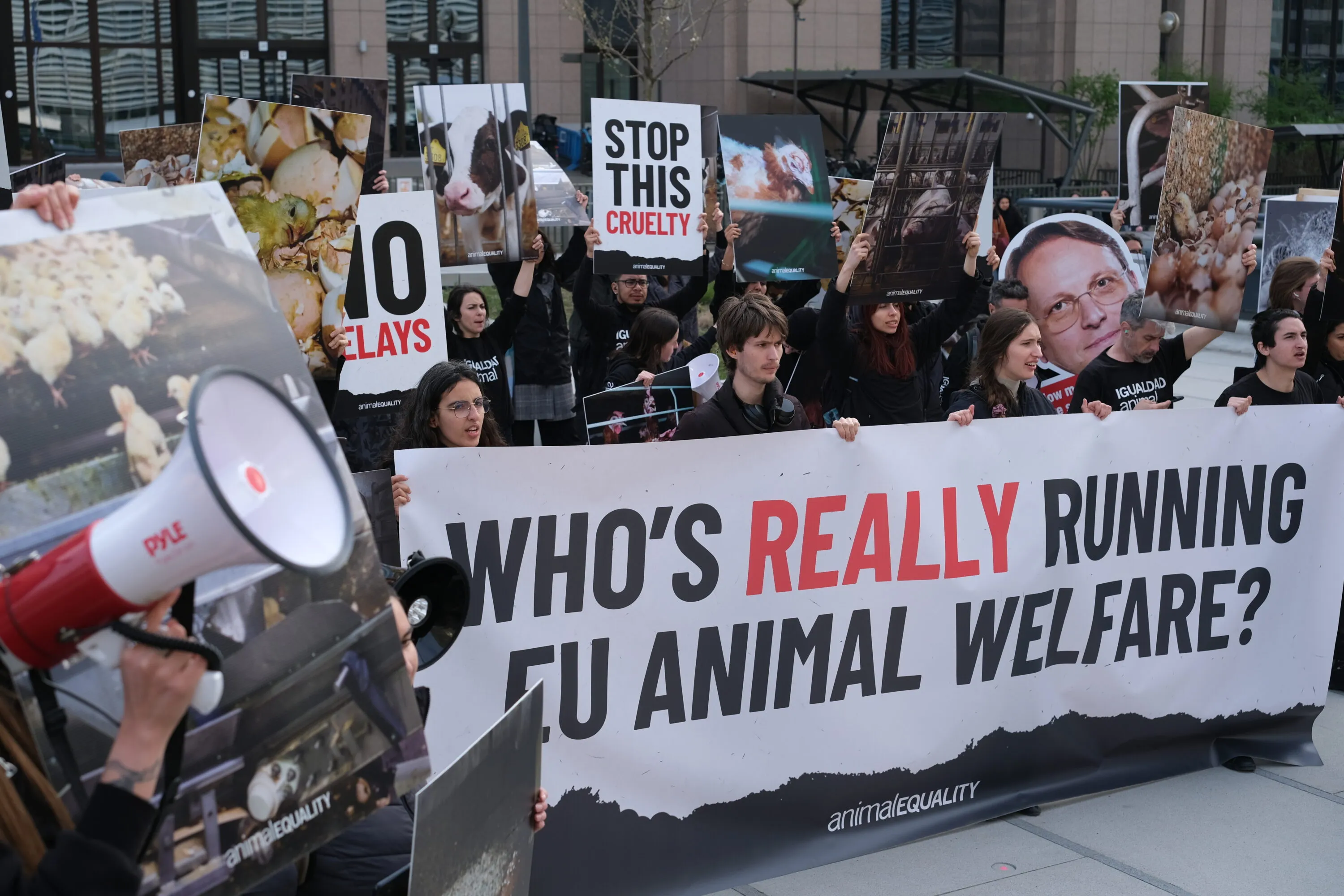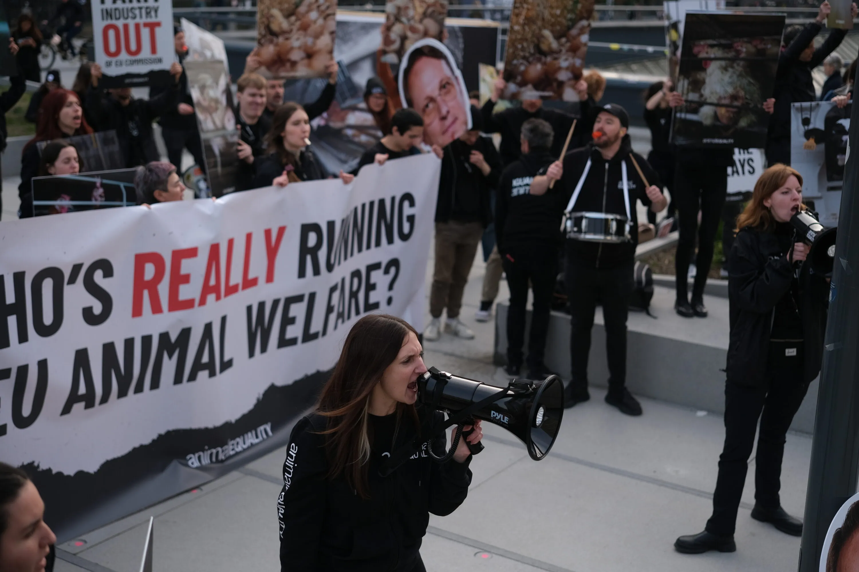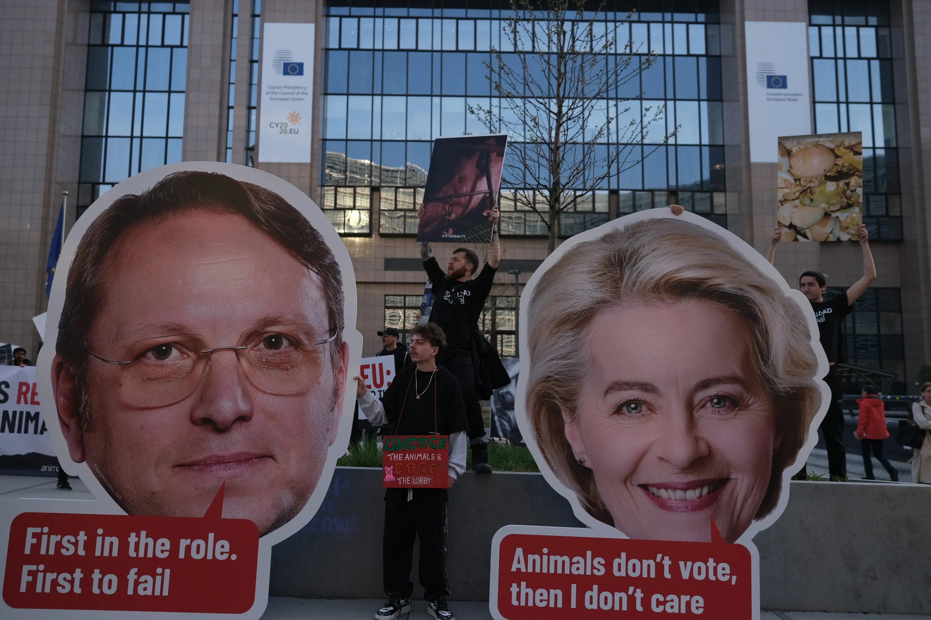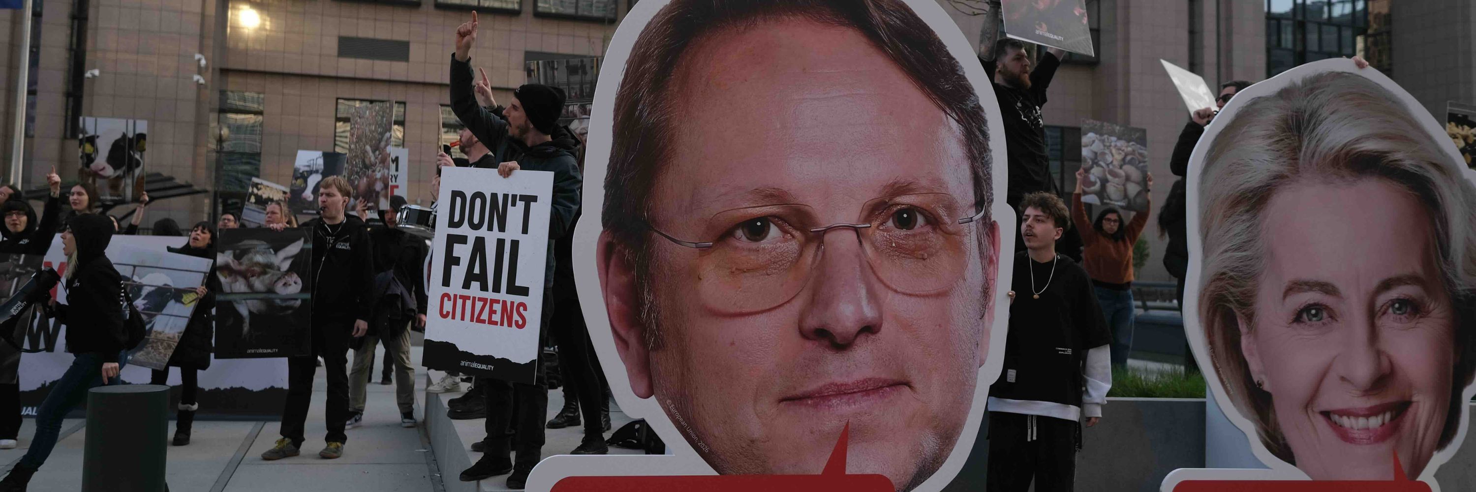 Più di 100 attivisti si sono riuniti davanti a Palazzo Berlaymont, sede della Commissione europea a Bruxelles, chiedendo ai commissari UE responsabili di milioni di animali in Europa di rendere conto di uno squilibrio documentato nell’accesso alle decisioni politiche in materia di benessere animale.