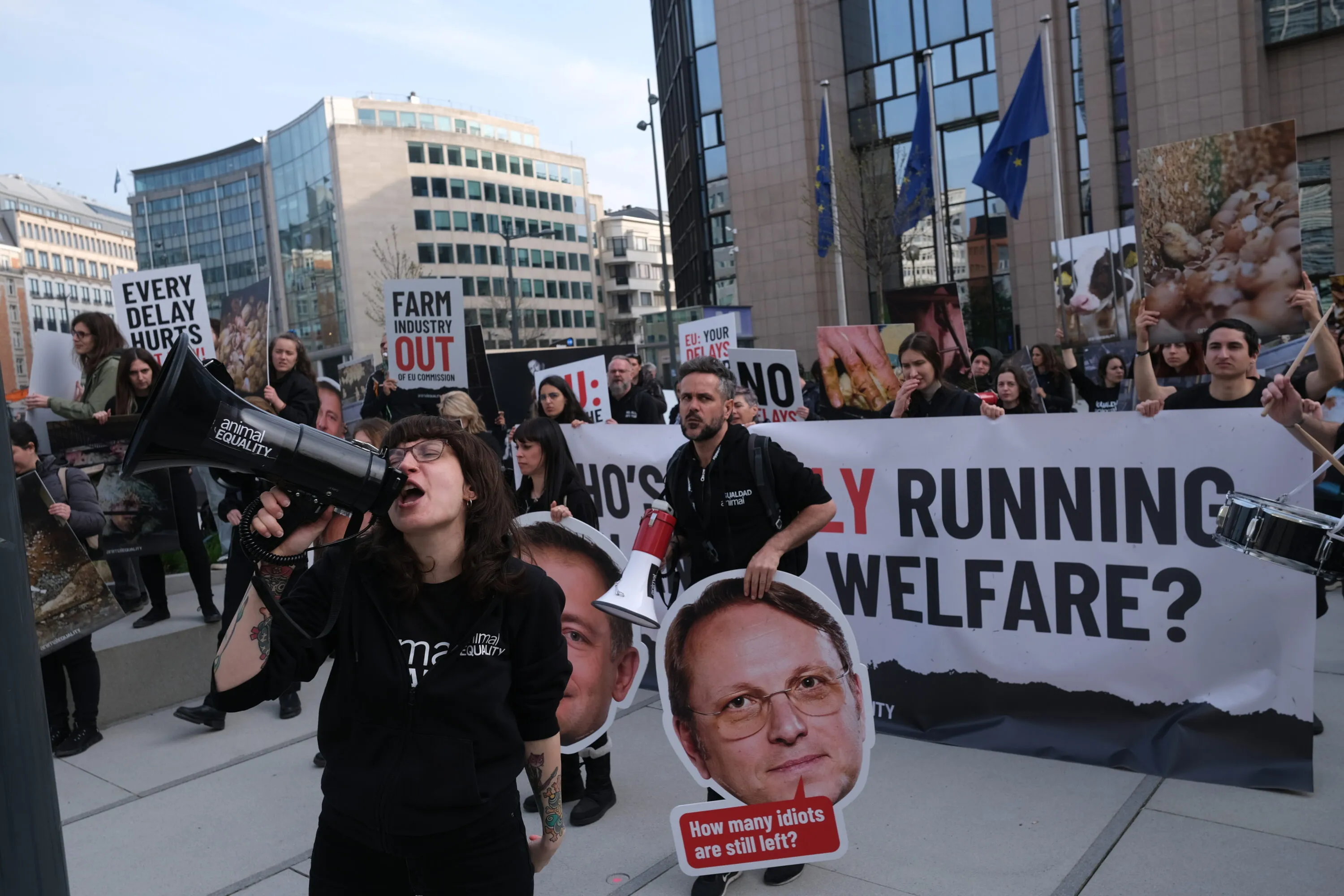 Per denunciare l’ingerenza dell’industria, più di un centinaio di manifestanti sono scesi in piazza chiedendo alla Commissione europea di non ignorare le informazioni fornite da Animal Equality e di impegnarsi a proteggere gli animali allevati a scopo alimentare.