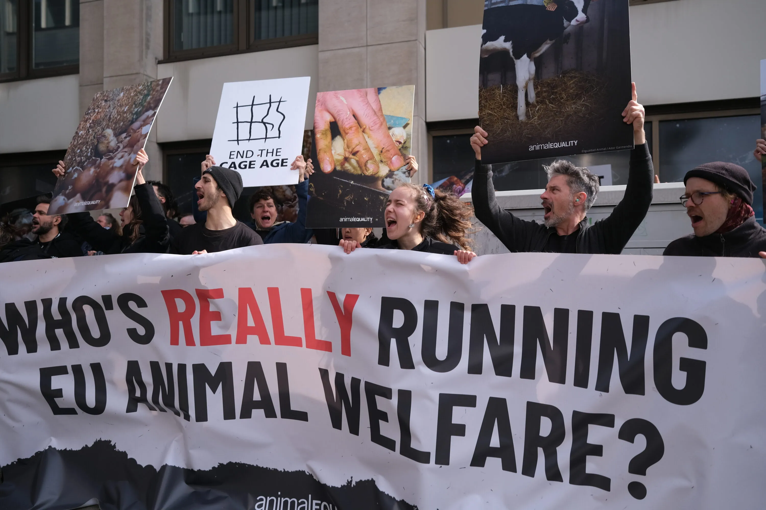 Per denunciare questa influenza, con i nostri attivisti abbiamo organizzato una serie di proteste a Bruxelles davanti alle sedi delle istituzioni europee interessate. Tra queste, il 14 aprile, l’organizzazione ha realizzato una proiezione storica sull’edificio Berlaymont della Commissione europea a Bruxelles, denunciando l’influenza dell’industria zootecnica sulle autorità europee che dovrebbero essere responsabili del benessere animale.